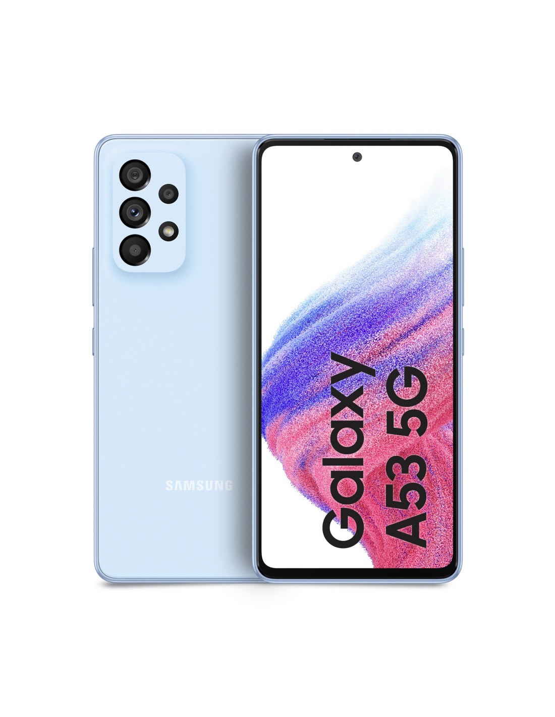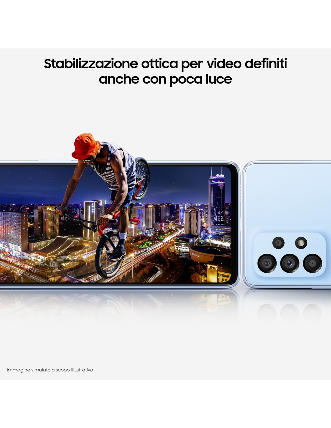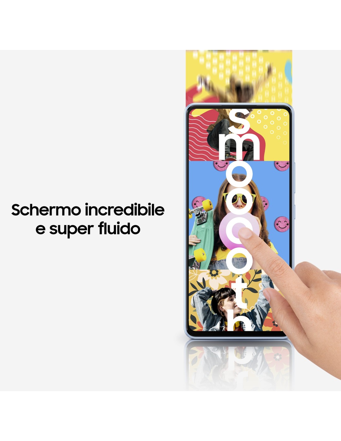 Samsung Galaxy A53 5G Display 6.5” FHD+ Super AMOLED Doppia SIM Android 12, RAM 8 GB , 256 GB, 5.000 mAh, Awesome Blue. Dimensioni schermo: 16,5 cm (6.5"), Risoluzione del display: 2400 x 1080 Pixel, Tipo di display: SAMOLED. Famiglia processore: Samsung Exynos, Modello del processore: 1280. Capacità della RAM: 8 GB, Capacità memoria interna: 256 GB. Risoluzione fotocamera posteriore (numerico): 64 MP, Tipo di fotocamera posteriore: Telecamera per quad. Capacità della scheda SIM: Dual SIM ibrida. Sistema operativo incluso: Android 12. Capacità della batteria: 5000 mAh. Colore del prodotto: Blu. Peso: 189 g