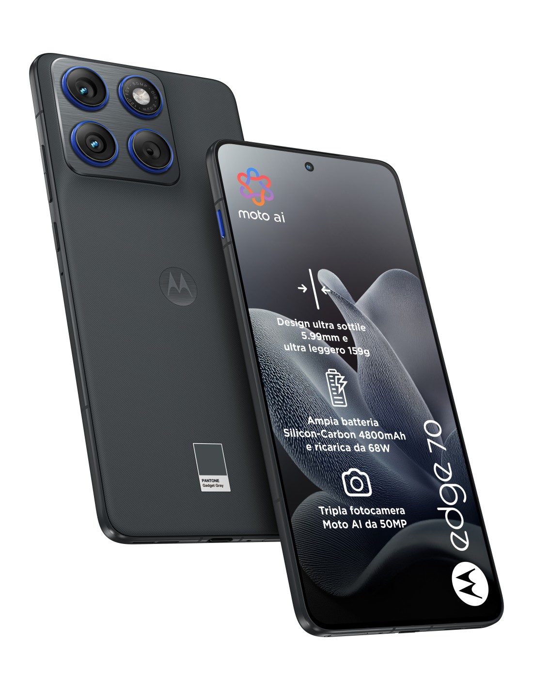 Ti presentiamo Motorola Edge 70, dal design ultra sottile 5.99mm e ultra leggero 159g con protezione avanzata Military Standard e resistenza IP68 e IP69. Scatta immagini eccezionali grazie al sistema di fotocamere da 50 MP OIS e ultragrandangolare. Goditi i contenuti sull’ampio display Super HD da 6,67”. La ricarica TurboPower™ da 68W fornisce autonomia rapidamente. Prova performance rapide ed efficienti con la batteria Silicon-Carbon da 4800mAh e il processore Qualcomm Snapdragon® 7 Gen 4. Con 12GB di RAM e 512GB di memoria.