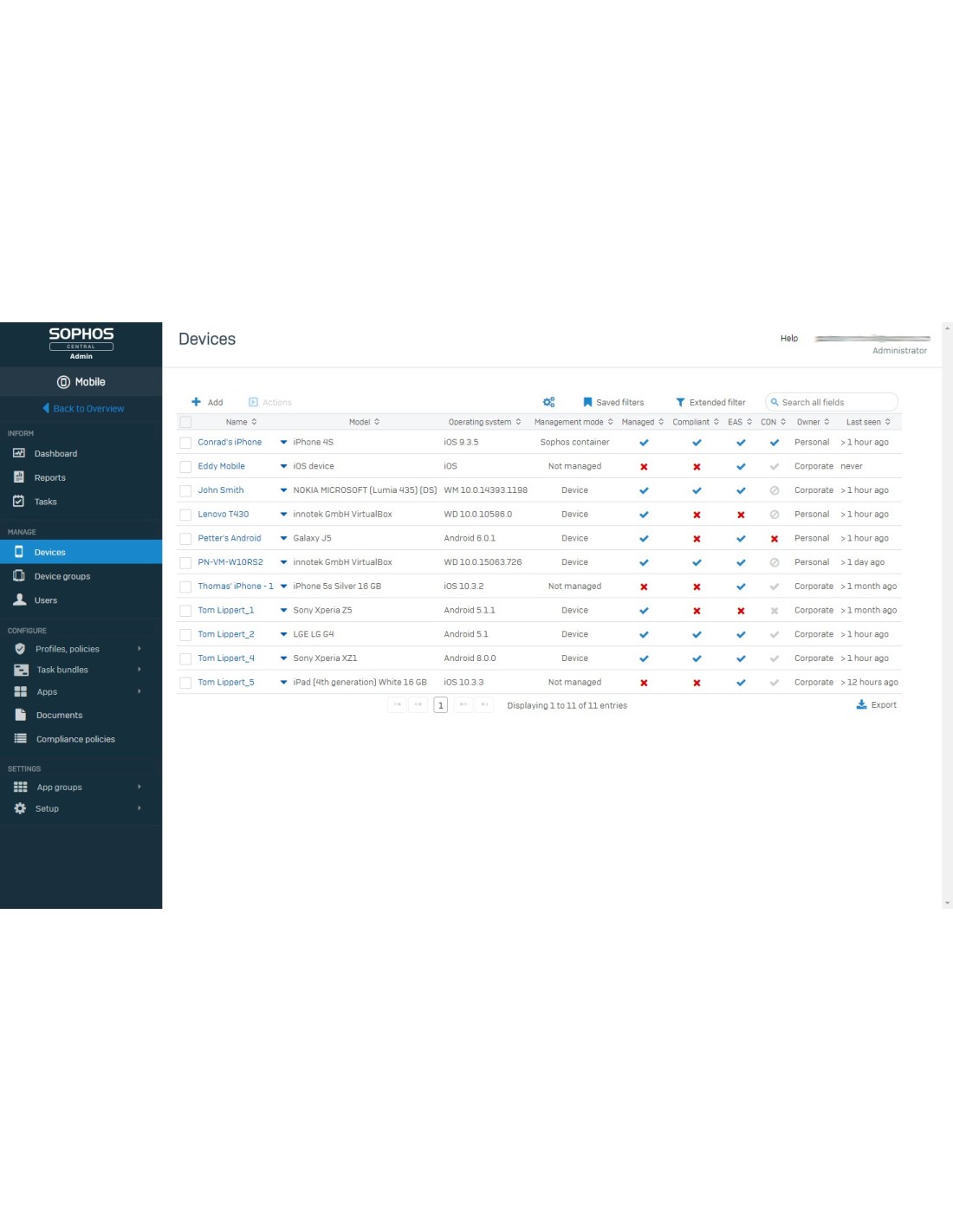 Sophos Mobile consente di proteggere i dispositivi forniti in dotazione dall’azienda, i dispositivi personali, o una combinazione dei due, tutto con il minimo sforzo. La gestione limitata al container offre agli amministratori pieno controllo sui contenuti aziendali memorizzati nelle app Sophos Secure Email e Sophos Secure Workspace, senza richiedere la gestione dell’intero dispositivo mobile. Questa opzione è ideale, ad esempio, negli scenari Bring Your Own Device (BYOD), in quanto permette di proteggere e controllare e-mail e dati aziendali senza invadere la privacy degli utenti.