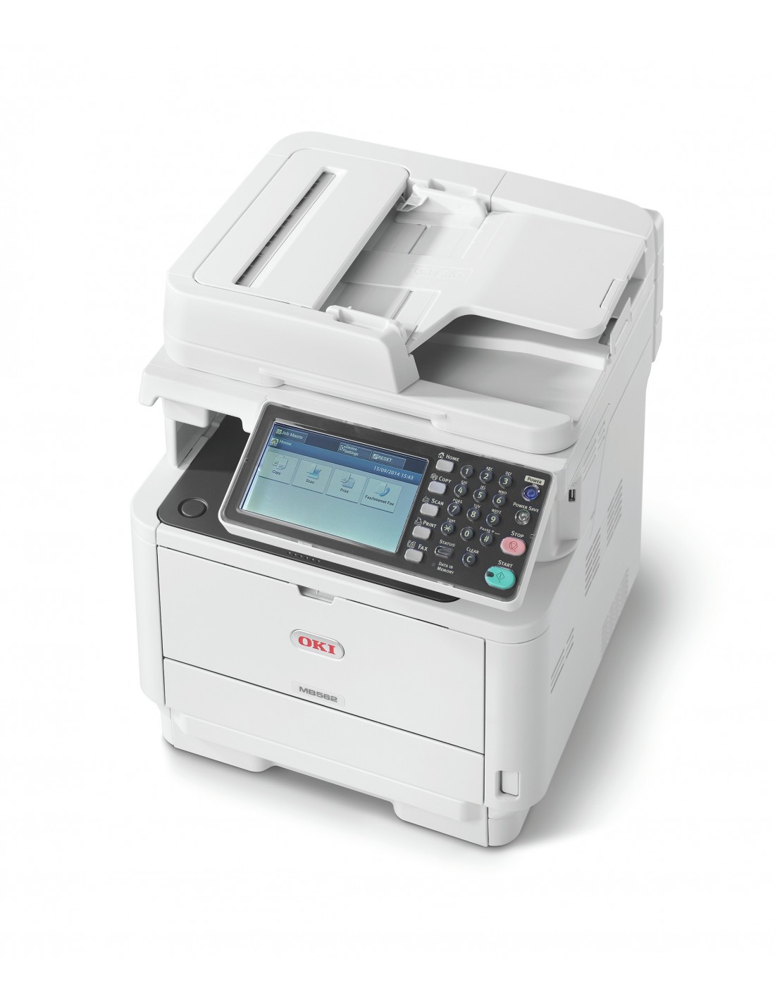 OKI MB562dnw. Tecnologia di stampa: LED, Stampa: Mono stampa, Risoluzione massima: 1200 x 1200 DPI. Copia: Mono copia, Risoluzione di copia massima: 600 x 600 DPI. Scansione: Scansione a colori, Risoluzione di scansione ottica: 600 x 600 DPI. Fax: Mono fax. Massimo formato carta serie ISO A: A4. Wi-Fi. Colore del prodotto: Nero, Bianco