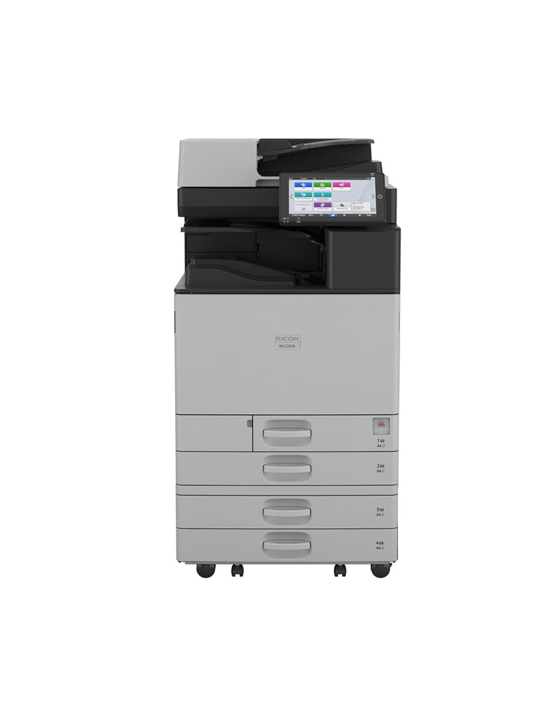 Ricoh IM C2010A. Tecnologia di stampa: Laser, Stampa: Stampa a colori, Risoluzione massima: 4800 x 1200 DPI. Copia: Copia a colori, Risoluzione di copia massima: 600 x 600 DPI. Scansione: Scansione a colori, Risoluzione di scansione ottica: 1200 x 1200 DPI. Fax: Mono fax. Funzione duplex: Copia, Stampa. Massimo formato carta serie ISO A: A3. Colore del prodotto: Nero, Bianco
