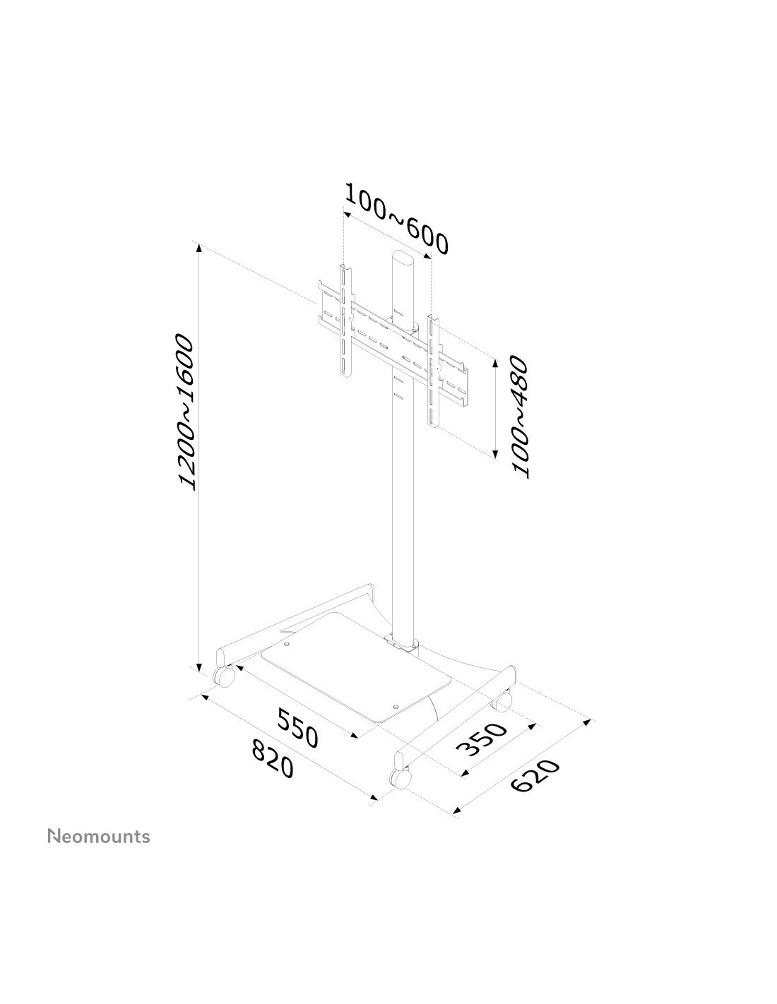 Il supporto a pavimento Neomounts by Newstar, modello PLASMA-M1600 è un mobiletto portatile per schermi LCD/LED/Plasma fino a 70" (178 cm) con altezza regolabile da 120 a 160 cm. Utilizzate un supporto a pavimento per sfruttare pienamente le capacità del vostro schermo. Il carrello è dotato di quattro solide ruote piroettanti, di cui le due anteriori dotate di freno.