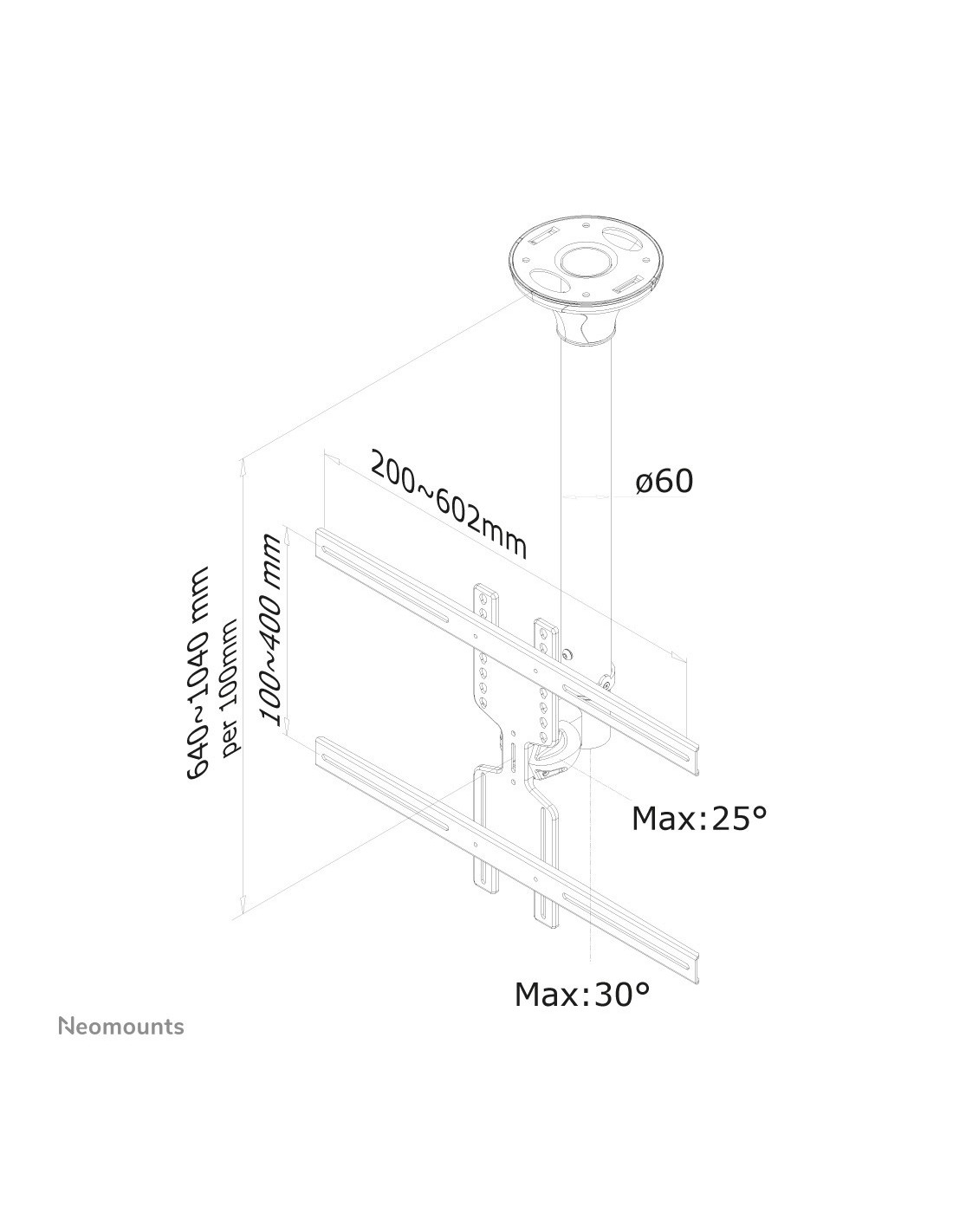 Neomounts by Newstar Supporto da soffitto per schermi LCD/LED/Plasma. Peso massimo (capacità): 35 kg, Capienza minima dimensioni dello schermo: 81,3 cm (32"), Capienza massima dimensioni dello schermo: 152,4 cm (60"), Compatibilità interfaccia di montaggio (min): 200 x 200 mm, Compatibilità interfaccia di montaggio (max): 600 x 400 mm. Range di regolazione altezza: 640 - 1040 mm, Inclinazione: 0 - 25°, Angolo di rotazione: 60°. Colore del prodotto: Nero
