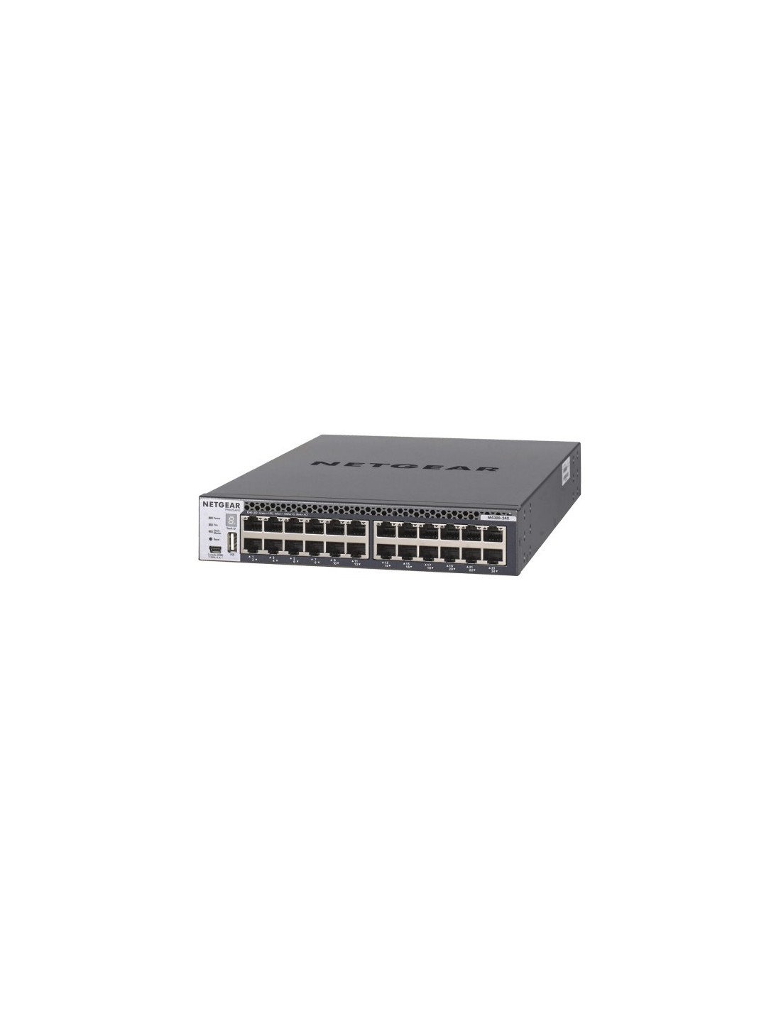 Netgear M4300-24X. Tipo interruttore: Gestito, Livello del commutatore: L3. Tipo di porte RJ-45: 10G Ethernet (100/1000/10000), Quantità di porte RJ-45: 24, Quantità porte USB 2.0: 2, Console port: RJ-45. Dimensioni tavola MAC: 16000 voci, Capacità di commutazione: 480 Gbit/s. Standard di rete: IEEE 802.1AX,IEEE 802.3ad,IEEE 802.3aq,IEEE 802.3az. Connettore di alimentazione: Jack DC-ingresso. Montaggio rack, Fattore di forma: 1U
