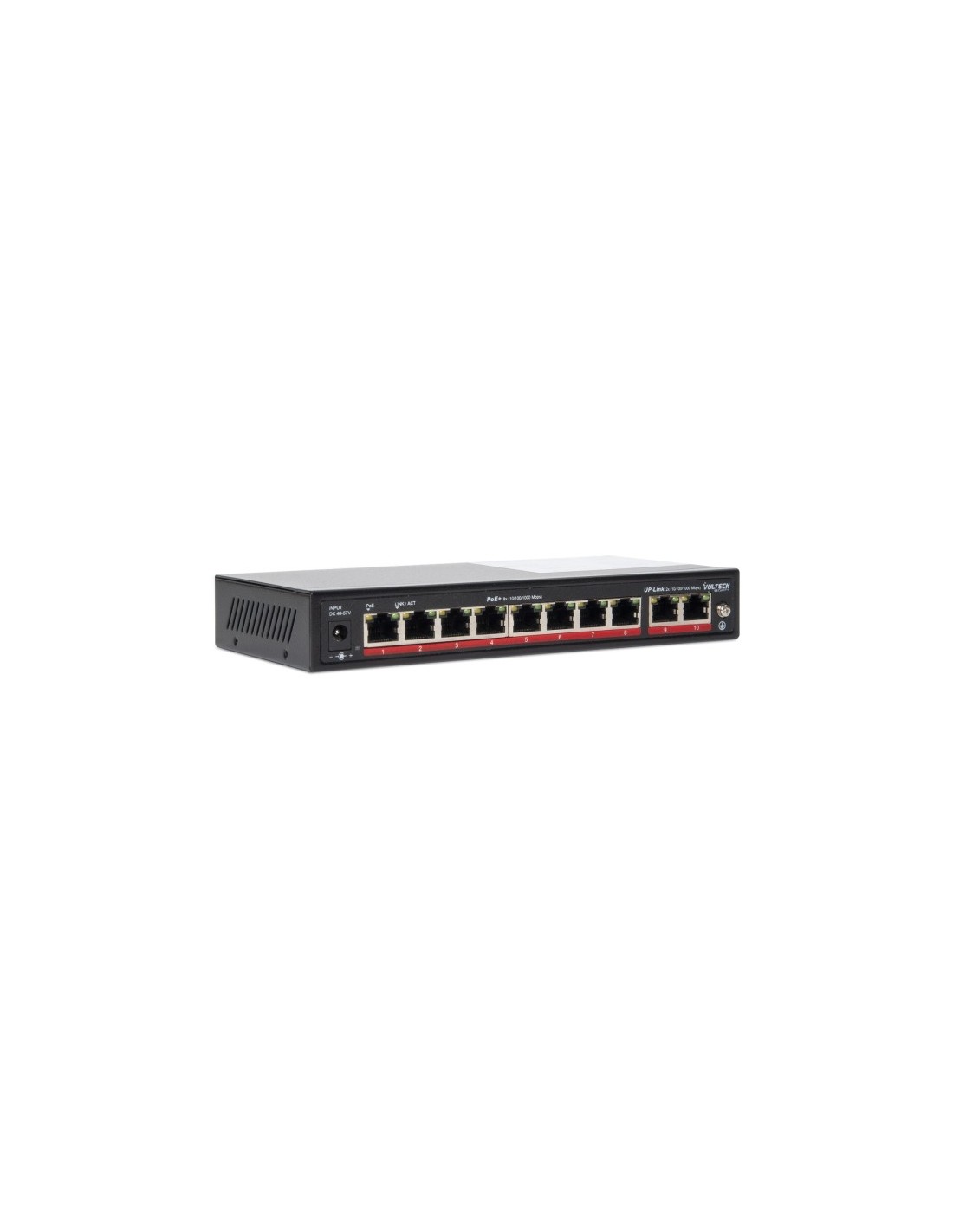 Vultech Security Switch PoE+ Gigabit 8 porte 10/100/1000 GE + 2 porte Uplink 10/100/1000 GE 120W AI SMART. Tipo di porte RJ-45: Gigabit Ethernet (10/100/1000), Quantità di porte RJ-45: 10. Dimensioni tavola MAC: 16000 voci, Capacità di commutazione: 5,2 Gbit/s. Voltaggio input DC: 48 - 57 V. Connettore di alimentazione: Jack DC-ingresso. Supporto Power over Ethernet (PoE)