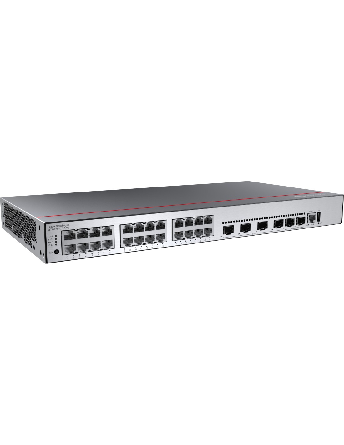Huawei CloudEngine S5735-L24P4XE-A-V2. Tipo interruttore: Gestito, Livello del commutatore: L3. Tipo di porte RJ-45: Gigabit Ethernet (10/100/1000), Quantità di porte RJ-45: 24, Quantità porte USB 2.0: 1, Console port: RJ-45. Capacità di commutazione: 176 Gbit/s. Standard di rete: IEEE 802.1x. Supporto Power over Ethernet (PoE). Montaggio rack, Fattore di forma: 1U