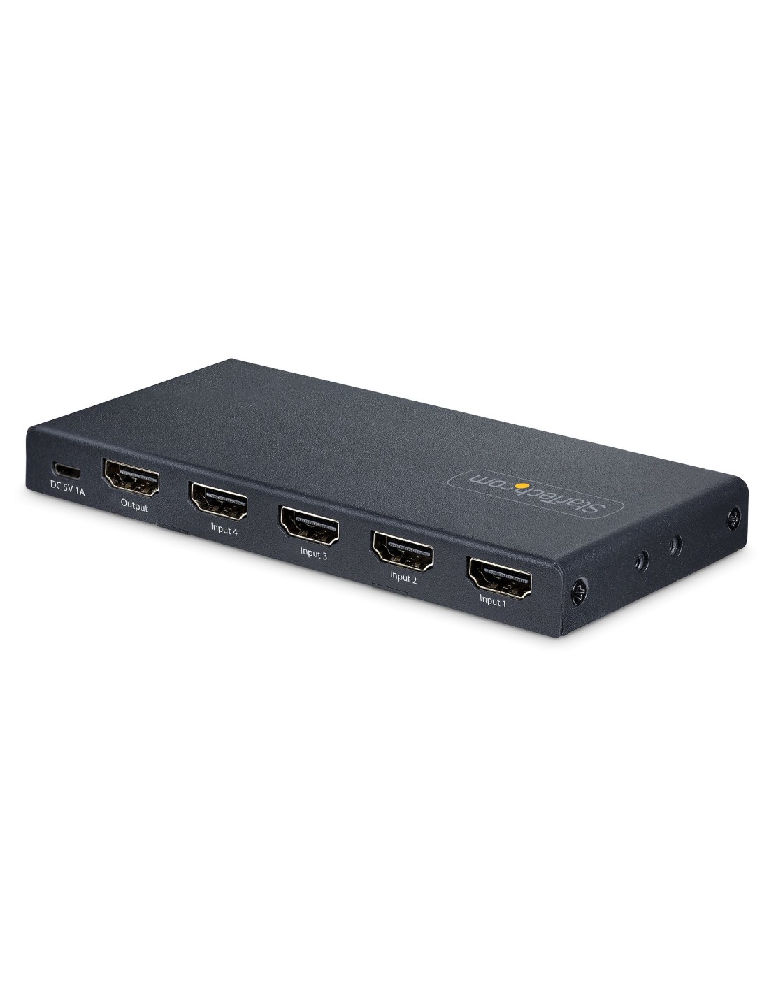 StarTech.com Switch HDMI 8K a 4 porte - Switcher HDMI 2.1 4K 120Hz HDR10+, 8K 60Hz UHD, Commutatore HDMI 4 In 1 - Commutazione automatica/manuale delle sorgenti - Switch con alimentatore e telecomando inclusi. Tipo porta video: HDMI, Tipo di porta USB: Micro-USB. Materiali: Metallo, Colore del prodotto: Nero, Massima distanza di funzionamento: 5 m. Tensione di ingresso AC: 100 - 240 V, Corrente di ingresso dell'alimentatore: 0,3 A, Adattatore di voltaggio output AC: 5 V. Larghezza: 61 mm, Profondità: 136 mm, Altezza: 14 mm. Larghezza imballo: 123 mm, Profondità imballo: 179 mm, Altezza imballo: 50 mm