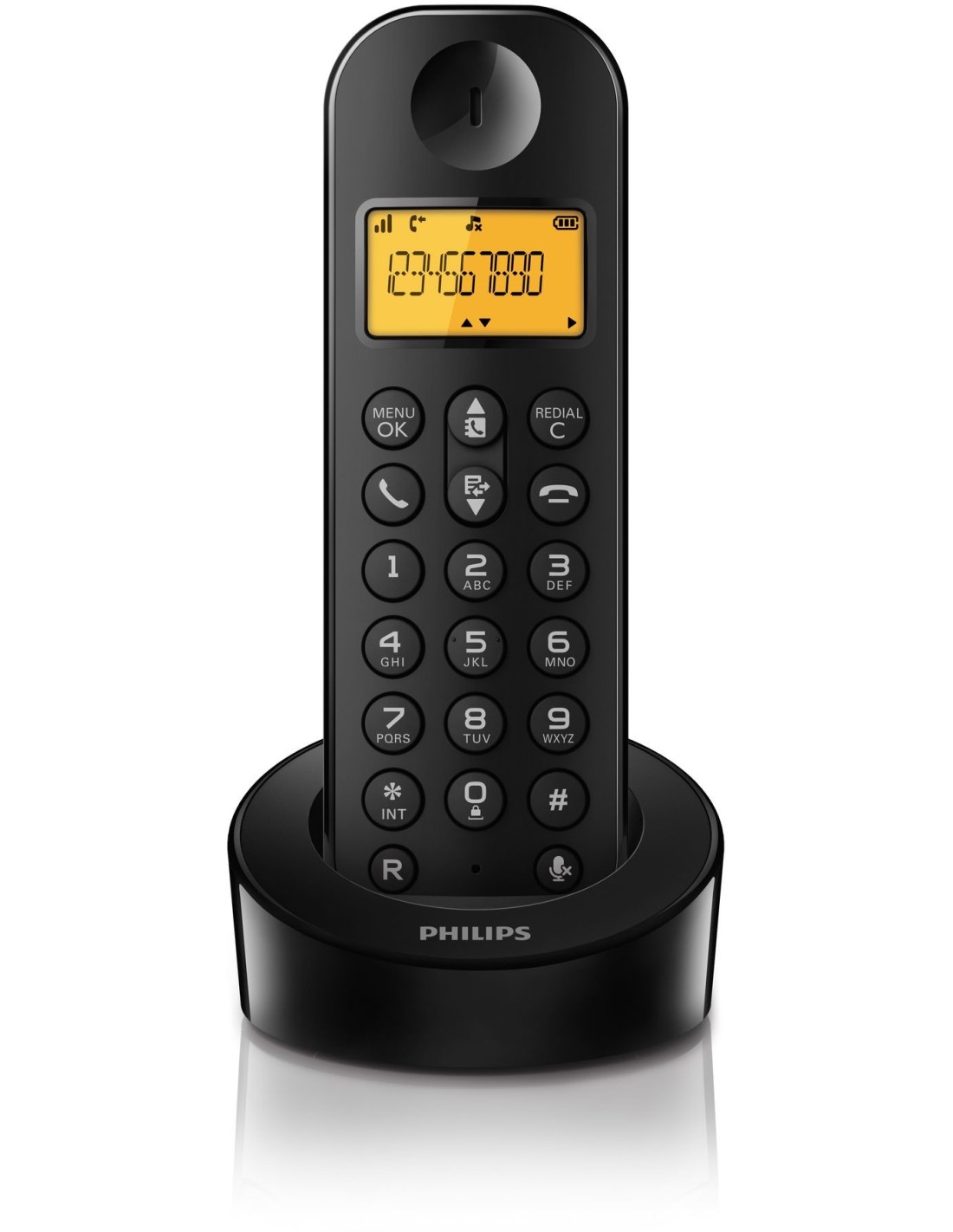 Philips Telefono cordless D1201B/23. Tipo: Telefono DECT, Raggio d'azione interno: 50 m, Raggio d'azione esterno: 300 m. Capacità rubrica: 50 voci. Identificatore di chiamata. Dimensioni schermo: 4,06 cm (1.6"). Colore del prodotto: Nero. Numero di cornette incluse: 1