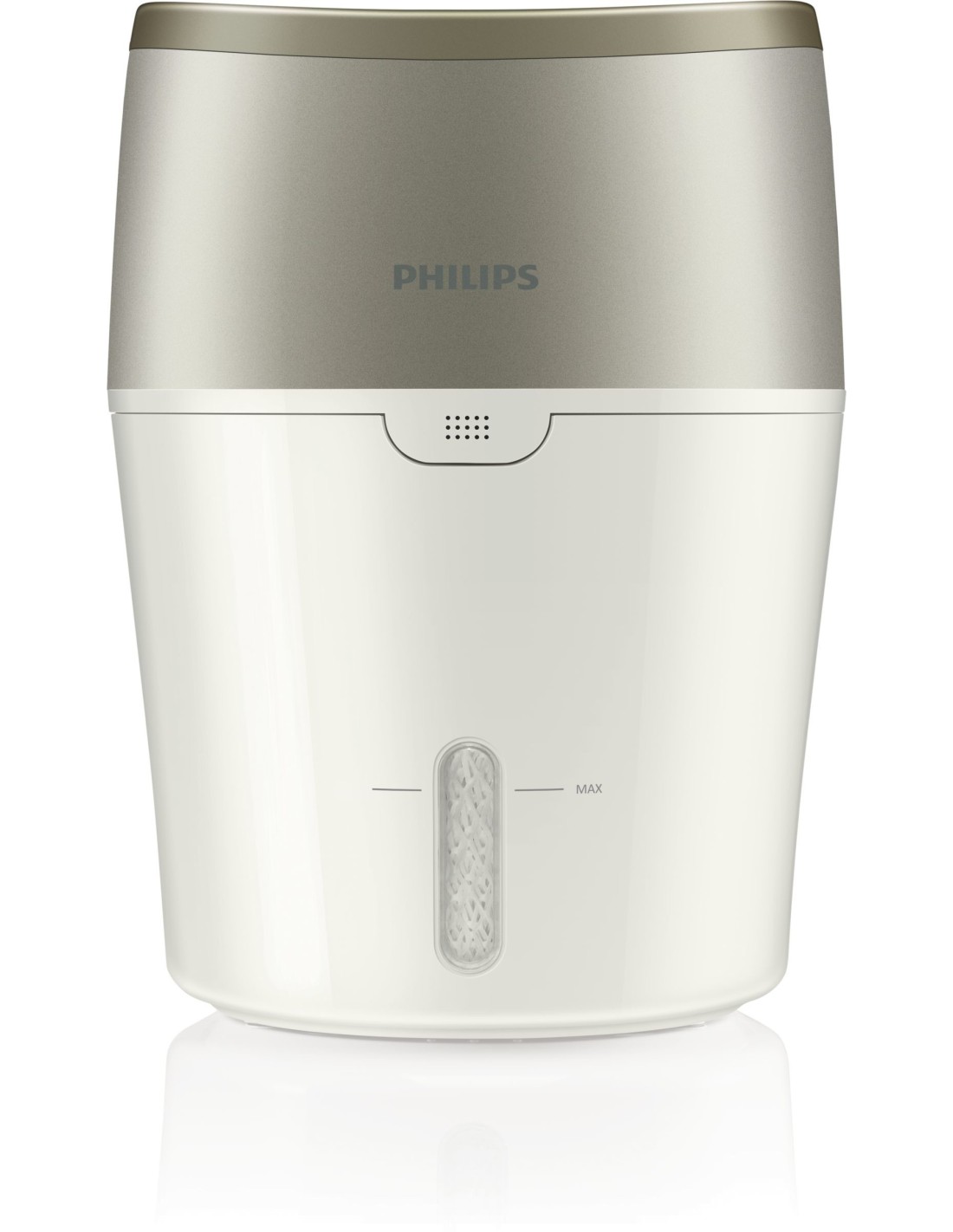 Controllo automatico e tecnologia di evaporazione intelligente. L'umidificatore Philips combatte l'aria secca con la massima precisione. Distribuisce in maniera uniforme l'aria umidificata per tutta la stanza e diffonde il 99% in meno di batteri rispetto a quelli a ultrasuoni.