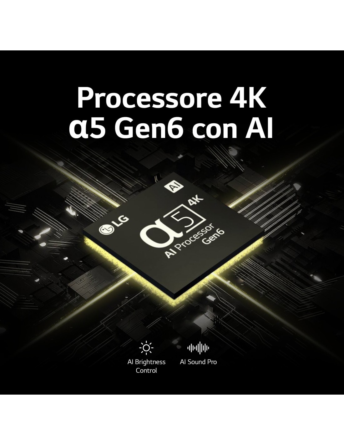 Processore α5 Gen6Il nuovo processore α5 Gen6 migliora i contenuti che guardi sul TV attraverso un'accurata elaborazione delle immagini e del suono. Per le immagini, il processore trasforma in 4K anche i contenuti a una risoluzione inferiore e controlla la luminosità dello schermo applicando dei sofisticati algoritmi basati sull'Intelligenza Artificiale. Per il suono, la funzione AI Sound riconosce cosa stai riproducendo e adatta di conseguenza la resa audio.