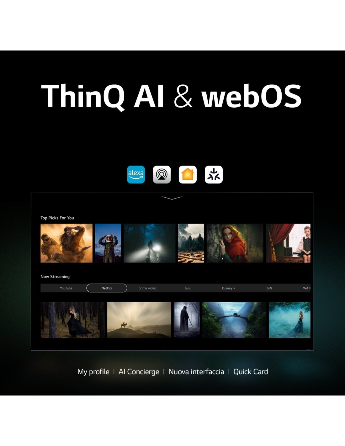 Smart TV con ThinQ AI, webOS 23 e comandi vocaliQuesto TV è davvero intelligente, perché integra l'assistente ThinQ AI che ti consiglia cosa vedere in base alle tue abitudini e risponde ai tuoi comandi vocali. Grazie alla piattaforma smart TV webOS 23 trovi tutti ancora più rapidamente, grazie alle schede tematiche accessibili direttamente dalla schermata principale. Inoltre, trovi tantissimi servizi di streaming per non perderti le serie TV e i film più chiacchierati del momento.