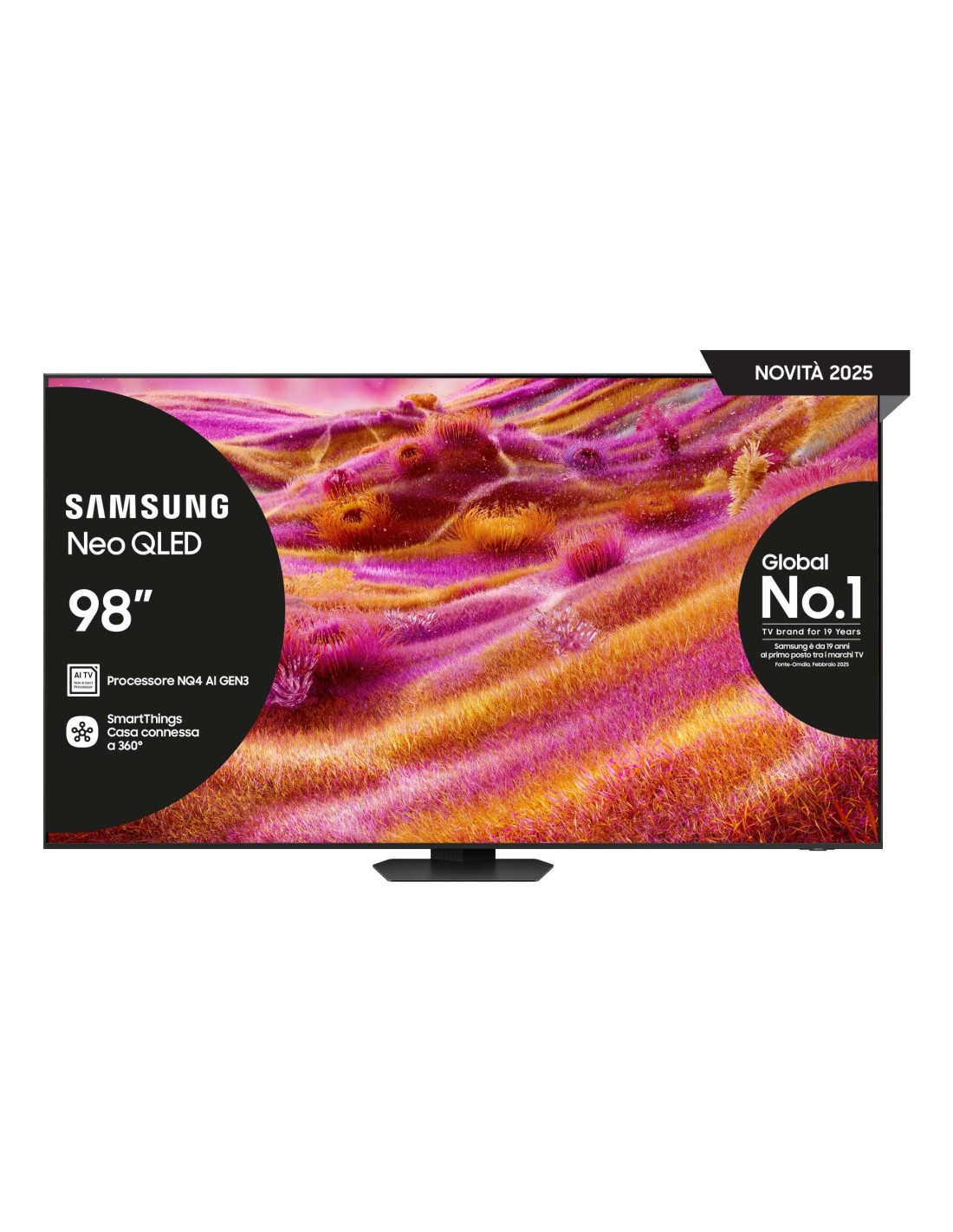 Samsung Smart TV 98” QE98QN90FATXZT Neo QLED 4K Mini LED 2025. Dimensioni diagonale schermo: 2,49 m (98"), Risoluzione del display: 3840 x 2160 Pixel, Tipologia HD: 4K Ultra HD, Tecnologia display: Neo QLED, Forma dello schermo: Piatto. Smart TV. Tecnologia di interpolazione del movimento: Motion Xcelerator. Formato del segnale digitale: DVB-C, DVB-S2, DVB-T2. Wi-Fi, Collegamento ethernet LAN. Colore del prodotto: Nero