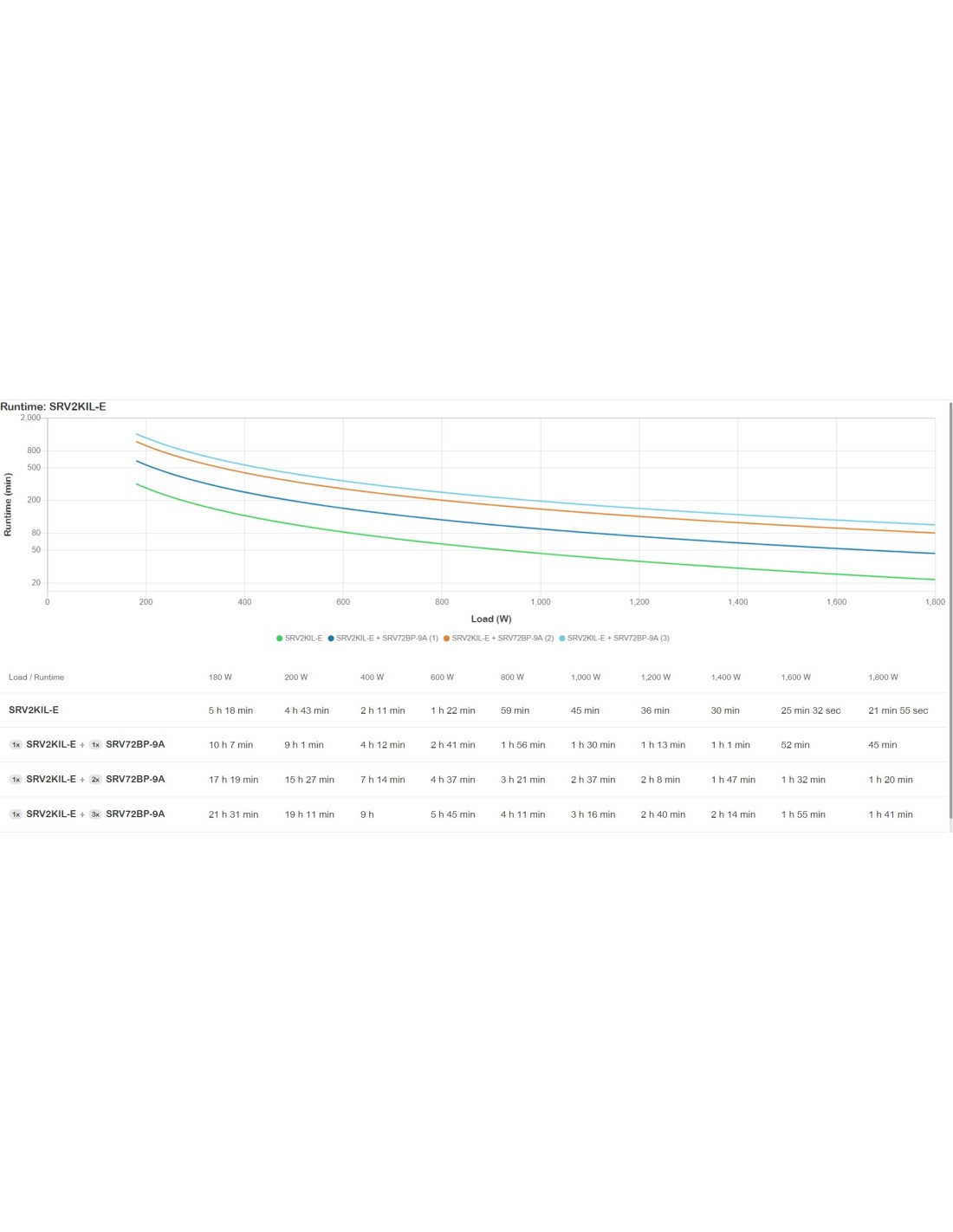 APC SRV2KIL-E. Potenza in uscita: 2 kVA, Potenza in uscita: 1800 W, Forma d'onda: Sinusoidale. Tipo di uscita AC: IEC 60320, Presa di corrente: Accoppiatore C20. Tecnologia batteria: Acido piombo (VRLA), Voltaggio della batteria: 72 V, Tempo di ricarica: 5,5 h. Colore del prodotto: Nero, Codice di protezione internazionale (IP): IP20. Larghezza: 335 mm, Profondità: 425 mm, Altezza: 336 mm