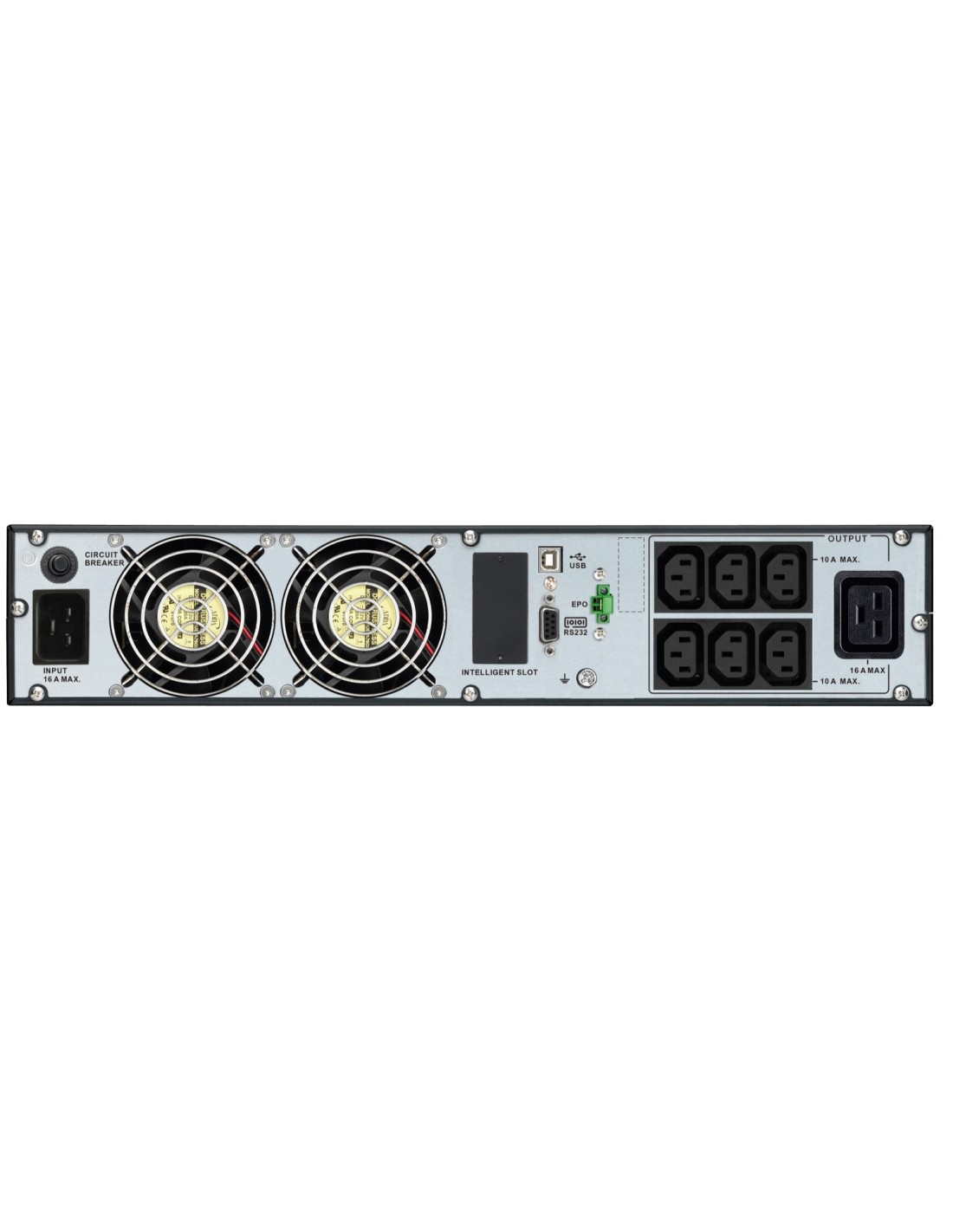 APC SRV3KRI-E. Topologia UPS: Doppia conversione (online), Potenza in uscita: 2700 W, Forma d'onda: Sinusoidale. Tipo di uscita AC: Accoppiatore C13, Presa di corrente: Accoppiatore C19. Tecnologia batteria: Acido piombo (VRLA), Voltaggio della batteria: 72 V, Durata della batteria (max): 5 anno/i. Colore del prodotto: Nero, Capacità di rack: 2U, Lunghezza cavo: 1,5 m. Larghezza: 438 mm, Profondità: 632 mm, Altezza: 86 mm