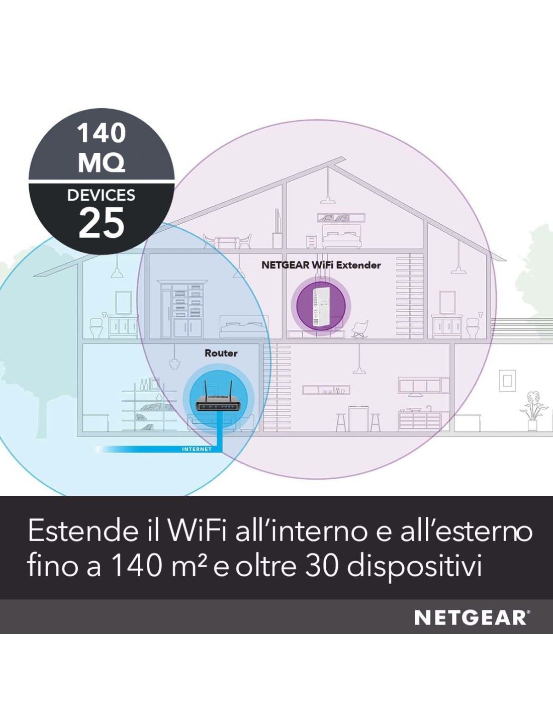 NETGEAR AC1750 Dual Band Ripetitore WiFi Mesh aumenta la copertura WiFi domestica esistente per creare un potente Mesh WiFi per una maggiore copertura e velocità wireless. Funziona con qualsiasi router WiFi standard ed è ideale per attività di gaming e streaming video in HD. Ottieni la connettività di cui hai bisogno per il tuo iPad®, smartphone, laptop e per molti altri dispositivi. NETGEAR AC1750 Dual Band Ripetitore WiFi Mesh aumenta la copertura WiFi domestica esistente per creare un potente Mesh WiFi per una maggiore copertura e velocità wireless. Funziona con qualsiasi router WiFi standard ed è ideale per attività di gaming e streaming video in HD. Ottieni la connettività di cui hai bisogno per il tuo iPad®, smartphone, laptop e per molti altri dispositivi.